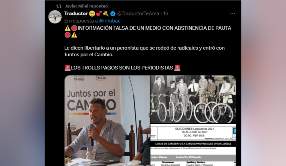 Minutos después, fue menos polémico, pero se despegó de la mano derecha de Pedro Puerta, del partido Activar (Juntos por el Cambio), que se colocó detrás de las líneas libertarias. Y apuntó con una medio porteño que menciona a Kiczka como diputado “libertario”.