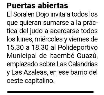 Soraire contó que el Soralen Dojo fue fundado en 1994 y funcionó primeramente sobre calle Catamarca, entre Buenos Aires y Félix de Azara de Posadas. “Después recorrió toda la ciudad, estuvo en el Jockey Club, en el Club Guaraní Antonio Franco, en la Casa Paraguaya… hasta hace algunos años, que nos radicamos definitivamente en Itaembé Guazú”, contó. Y como la escuela y Soraire iniciaron su actividad en agosto es que se respeta ese mes para organizar la Copa Mercosur, que contará con la fiscalización de la Federación Misionera de Judo (FMJ). “También nos ayuda el Ministerio de Deportes provincial y muchas otras personas, así que agradecemos a todos los que hacen posible esto, sin dudas va a ser una fiesta hermosa”, sintetizó Valeria.