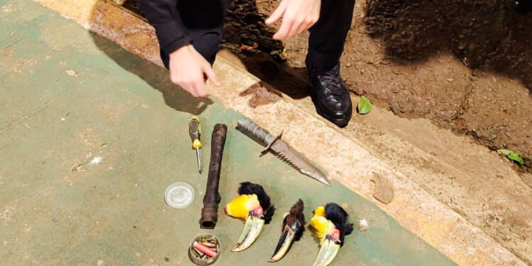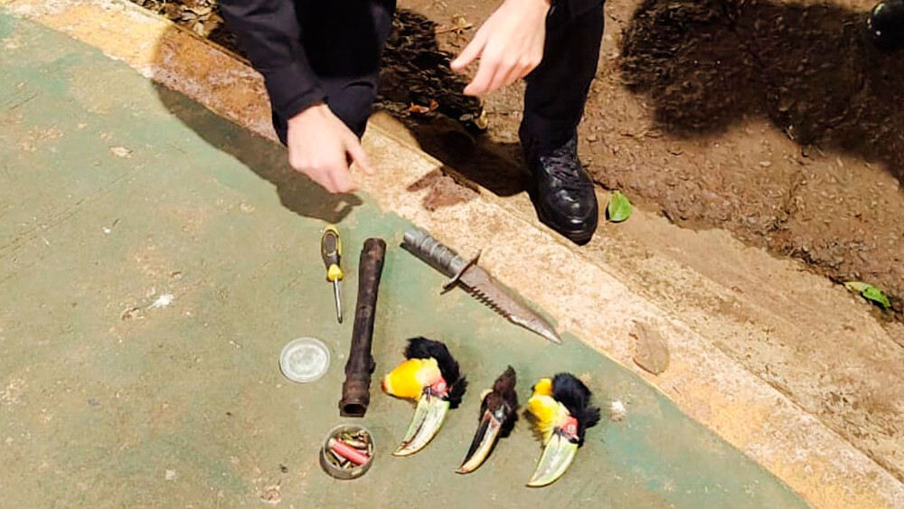 Luego de recabar datos sobre la ubicación de los cazadores, los policías los interceptaron a bordo de una motocicleta. En la requisa, se les incautó dos rifles, municiones y vainas servidas; además, efectivamente contaban con tres cabezas de tucanes, dos de picos verdes uno de arasarí fajado.