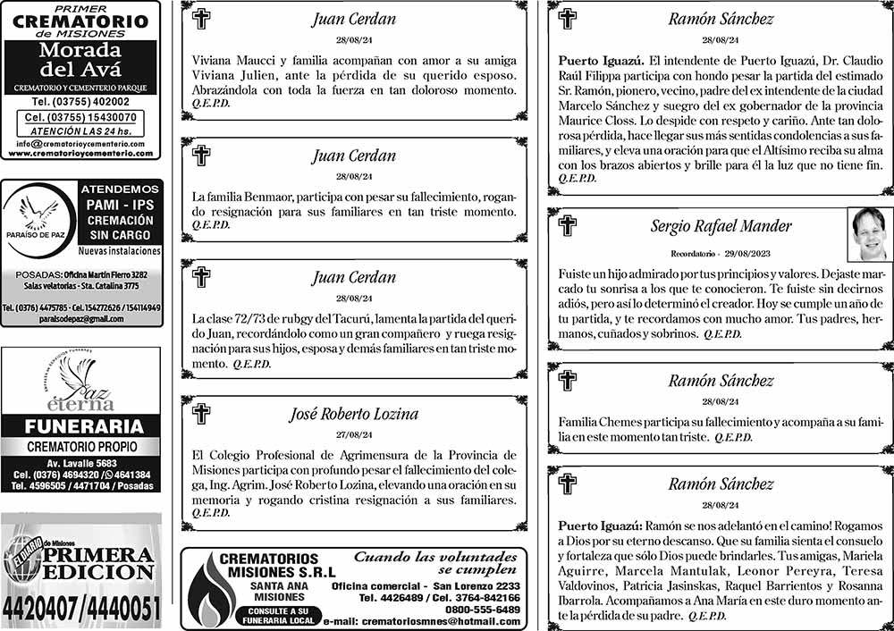 • Fúnebres del Miércoles 28 de Agosto de 2024