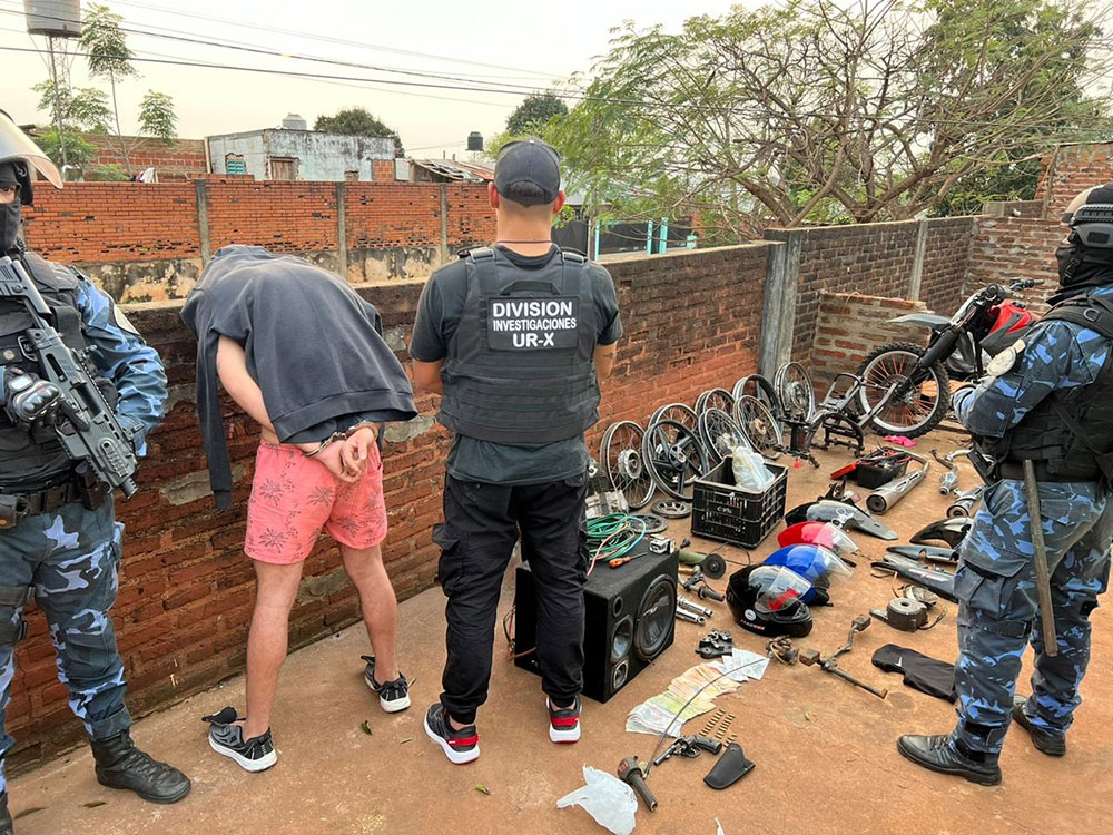 La primera incursión, efectuada en una vivienda del barrio San Isidro, resultó en la detención de un hombre de 23 años. Durante el allanamiento, se confiscaron una moto cross sin motor, un cuadro de moto, varias partes de motocicletas, un arma de fuego y diversos objetos que se sospecha fueron robados.