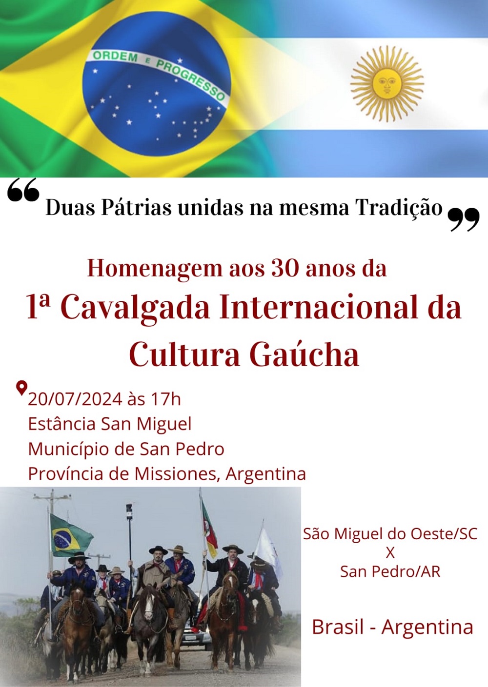 El 20 de julio de 2024 se cumplieron 30 años de la Primera Cabalgata Internacional de la Cultura Gaucha. La comitiva brasileña que visitó San Pedro en esta ocasión estuvo integrada por: Amauri Carvalho Salles, coordinador de la cabalgata; Vilson Trevisan, intendente de São Miguel Do Oeste; Edenilson Zanardi: viceintendente; Carlos Agostini: concejal de São Miguel Do Oeste; Chico Salles: concejal de Bandeirante, y João Carlos Valar, ex jefe comunal de São Miguel Do Oeste.