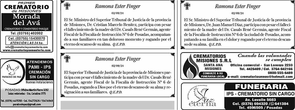 • Fúnebres del Lunes 2 de Septiembre de 2024