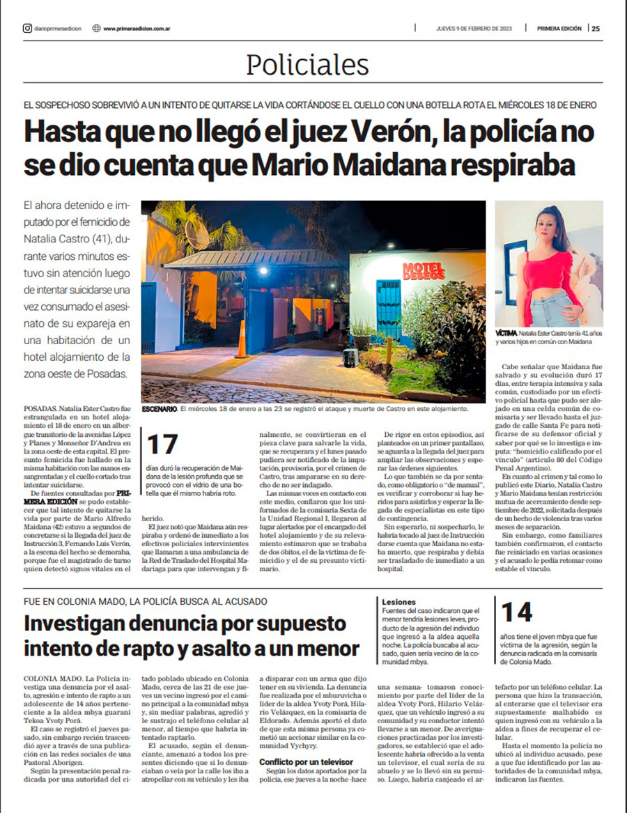 Por precaución avisaron a la policía y cuando los efectivos golpearon la puerta y al no tener respuesta, ingresaron con una orden judicial. Encontraron a la mujer sin vida en el baño y al hombre tirado en el piso con una herida en la yugular. Parecía que estaba muerto. El juez Verón llegó a la escena del crimen y se percató que Maidana aún tenía signos vitales. Así lo trasladaron al hospital donde permaneció varios días en coma.