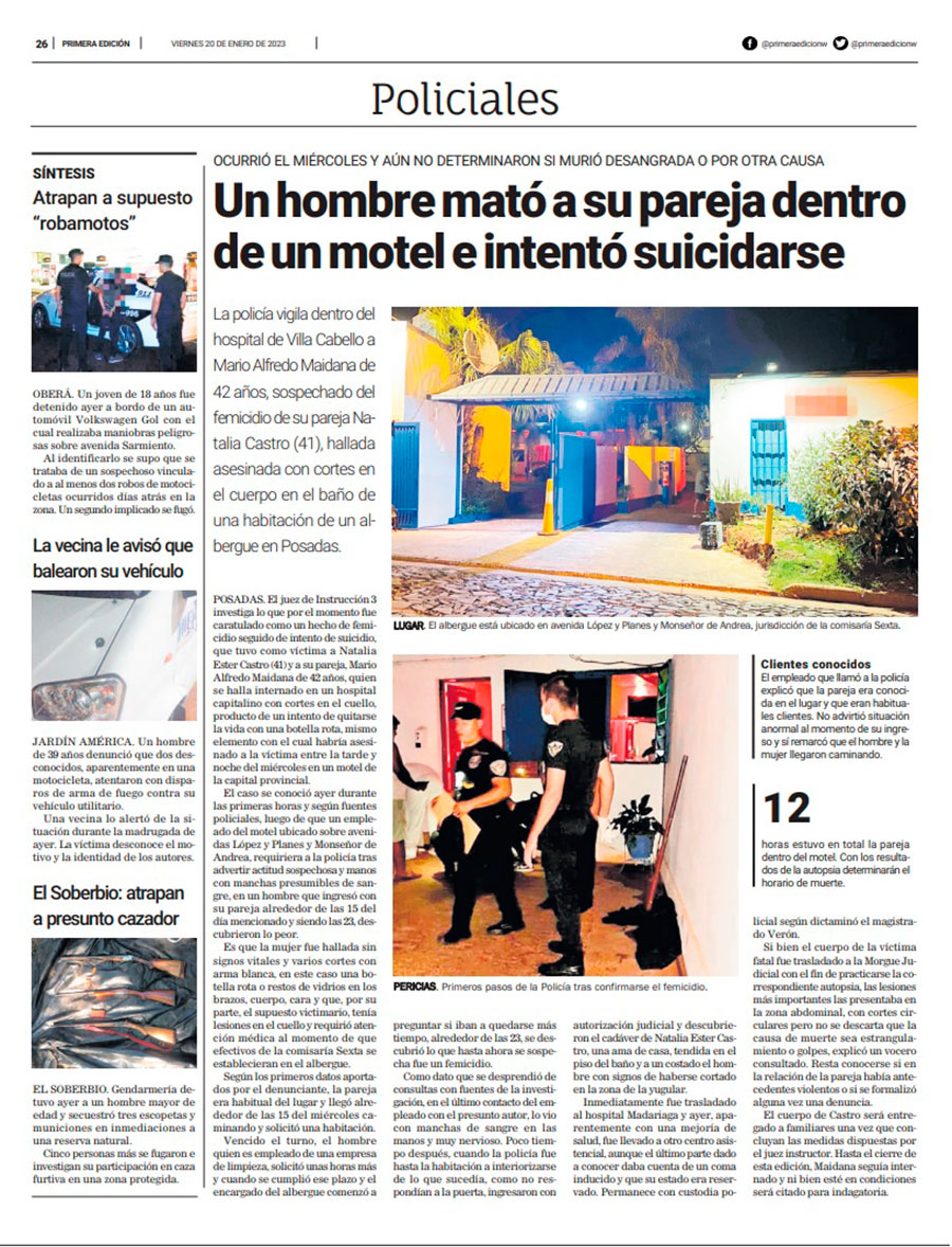 La autopsia a Natalia Castro determinó que su deceso se produjo por “estrangulamiento”. Además el cuerpo presentaba golpes y cortes hechos con el filo de una botella rota, la misma con la que Maidana se cortó el cuello para intentar suicidarse.