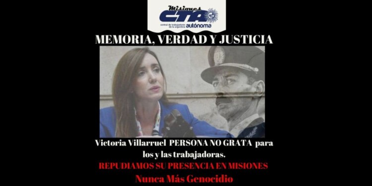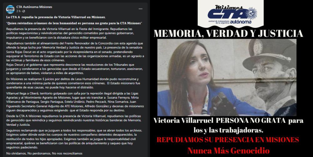 Por último, expone: “Desde la CTA A Misiones repudiamos la presencia de Victoria Villarruel, repudiamos las políticas de genocidio que reivindica y seguimos reivindicando nuestras históricas banderas de Memoria, Verdad y Justicia. Seguimos reclamando que se juzguen a todos los responsables, que se abran todos los archivos. Exigimos saber dónde están los cuerpos de nuestrxs compañerxs detenidxs desaparecidxs, la restitución de todos lxs hijxs apropiadxs. Exigimos también se juzgue la responsabilidad civil empresarial, quiénes se beneficiaron con las políticas de aniquilamiento y saqueo que hoy seguimos padeciendo.No olvidamos, No perdonamos, No nos reconciliamos”.