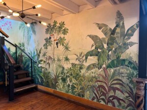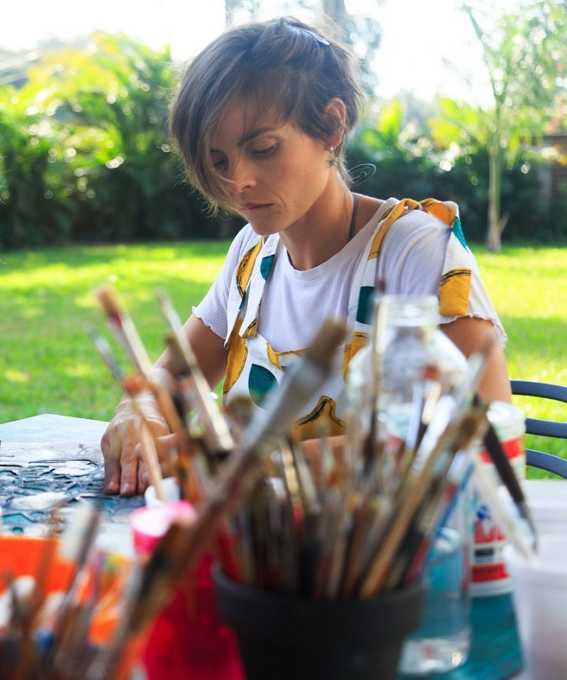 Un día en el taller, “me gusta para empezar a trabajar ordenarlo, limpiarlo, dejarlo bien bonito. Limpiar el piso con algún buen aroma, encender un rico sahumerio, buena música que me ayude a enfocarme y comenzar a pintar”. Ya casi que nos dan ganas de acompañarla, pero hay más, “los días son todos distintos absolutamente todos. Hay días en los que suma hasta una respiración y meditación, mientras que otros llegan con prisas, terminar algo y salir nuevamente a realizar un mural, y no faltan las noches de insomnio que terminan en el taller”, una extensión de su casa, de su mundo.