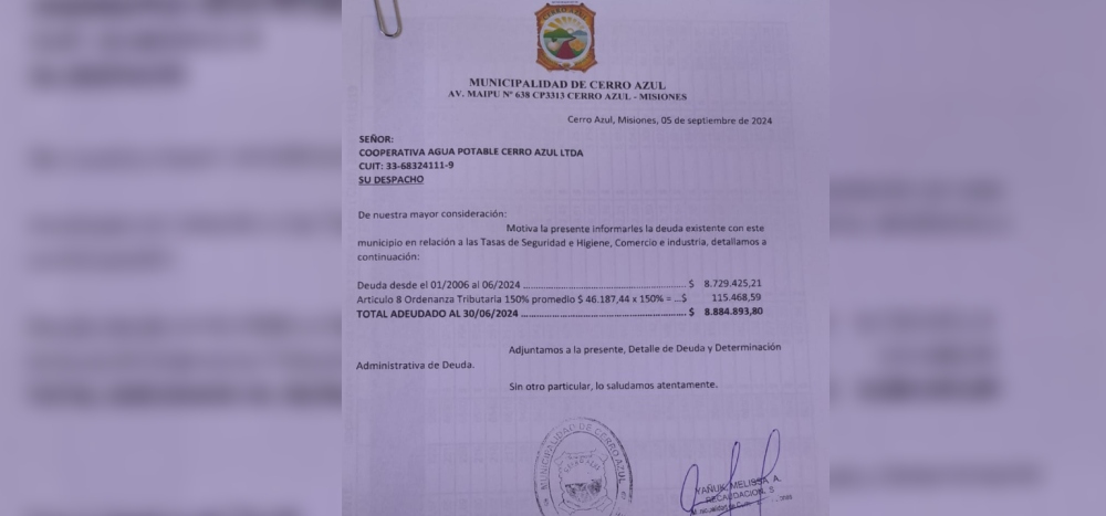 La disputa entre la Municipalidad de Cerro Azul y la Cooperativa de Agua Potable y de Otros Servicios Públicos Limitada (CAPCAL) de esa ciudad sumó un nuevo capítulo y parece no tener fin. En los últimos días, la Comuna le reclamó a la CAPCAL una deuda de más de ocho millones de pesos por adeudar las Tasas de Seguridad e Higiene, Comercio e Industria.