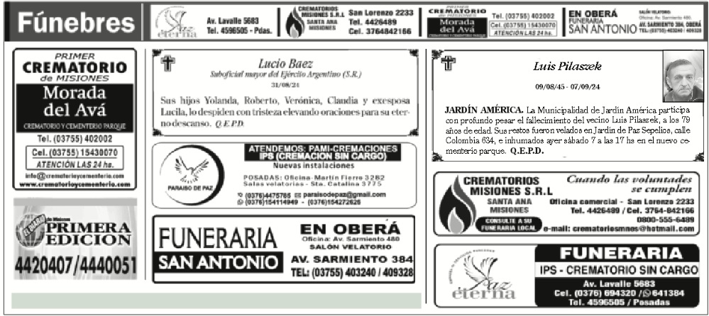 • Fúnebres del Sábado 7 de Septiembre de 2024