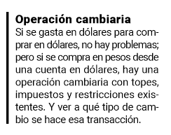 Allí es donde aparece el cepo. Si se gasta en dólares para comprar en dólares, no hay problemas; pero si se compra un producto en pesos desde una cuenta en dólares, hay una operación cambiaria.