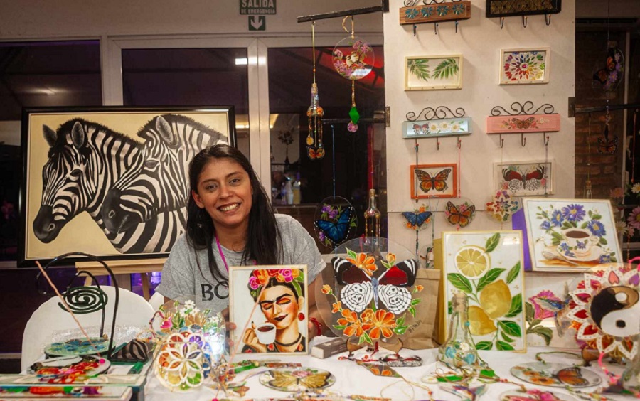 La técnica que más utiliza ella es pintar con lacas, así va combinando el vidrio con diferentes materiales, aplicando sobre madera, creando objetos decorativos y utilitarios.
