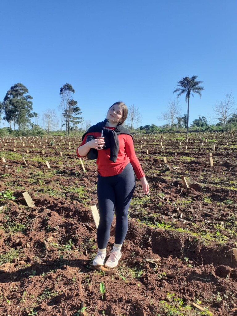 Florencia Hein, de 20 años, estudia Periodismo en la Universidad Nacional del Nordeste, en Corrientes. Cuando regresa a Jardín América dedica parte de su tiempo a colaborar en las actividades de la chacra. Su familia es productora de yerba mate y es socia de la Cooperativa de Productores Yerbateros de Jardín América, que vende sus productos bajo la marca Flor de Jardín.