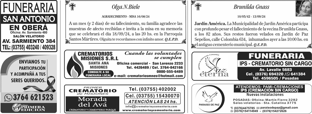 • Fúnebres del Sábado 14 de Septiembre de 2024