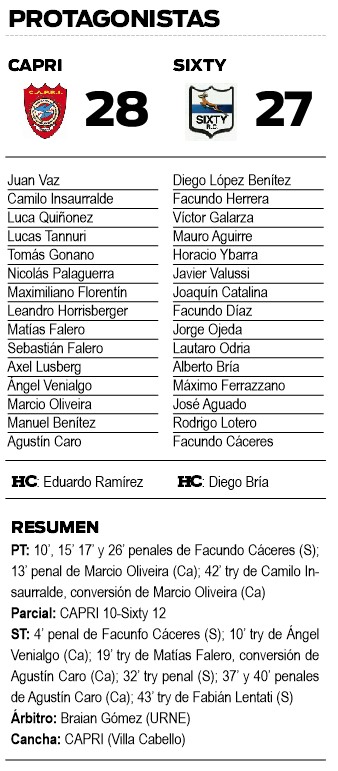 Sin embargo, a los 32 de juego, el árbitro Gómez sancionó un dudoso try penal para Sixty, que lo volvió a poner en partido. Por el lado de CAPRI, Agustín Caro no falló ante los palos, marcando penales a los 37 y 40 minutos, dándole la ventaja a los dirigidos por Eduardo “Mole” Ramírez.