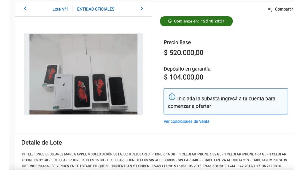 - Lote de 13 celulares Apple: Incluye modelos como el iPhone 6 en distintas capacidades (16 GB, 32 GB, 64 GB), iPhone 6S y iPhone 8 Plus. El precio base de este lote es de $520.000.