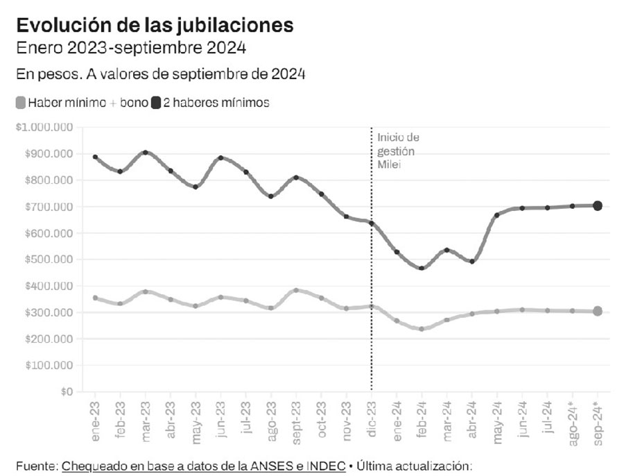 Entonces, para medir solamente la evolución durante el gobierno de Javier Milei, se puede tomar de diciembre de 2023 a septiembre de 2024. Entre enero y julio la variación del Índice de Precios al Consumidor (IPC) fue, según el INDEC, de 87%, el poder de compra de los haberes de quienes perciben el haber mínimo, el poder de compra del ingreso total, incluido el bono, fue en julio un 5% más bajo en comparación con lo percibido en diciembre de 2023. A esa caída de 5% todavía falta sumarle la inflación del 12 de diciembre, que fue de 28% provocada por la devaluación del peso que pasó de $400 a $820 por dólar.