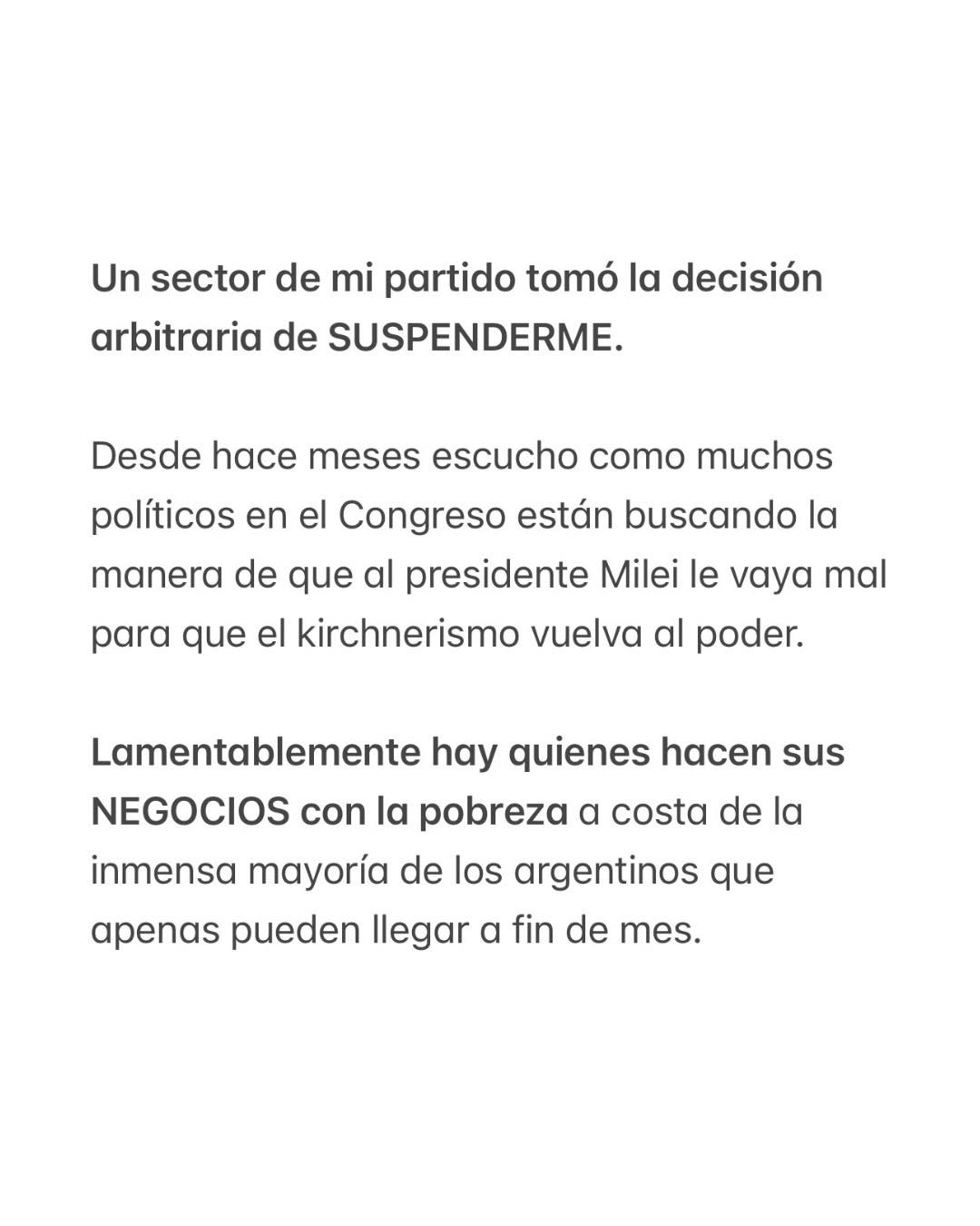 Siguió explicando que “Desde hace muchos meses escucho cómo muchos políticos en el Congreso están buscando la forma de que al presidente Milei le vaya mal para que el kirchnerismo vuelva al poder”. Acusó que “lamentablemente hay quienes hacen sus negocios con la pobreza, a costa de la inmensa mayoría de los argentinos que apenas puede llegar a fin de mes”.