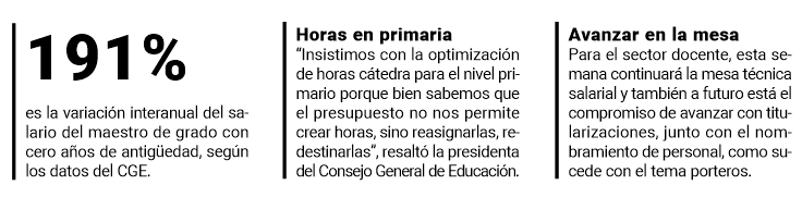 Respecto al balance de este año, destacaron además que los docentes de la provincia consiguieron una importante variación interanual, donde contabilizaron un 191% para el maestro de grado con cero años de antigüedad y un 176% para los que cuentan con 25 años. Por su parte, aquellos con 21 horas en nivel medio con 25 años de antigüedad alcanzaron un 197% de incremento interanual y un directivo nivel medio con los mismos años un 158%.