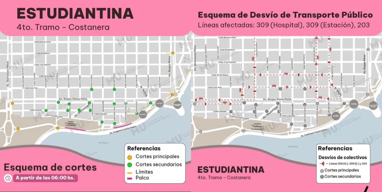 Lo dicho, desde temprano hay cortes de calles principales y secundarias en inmediaciones del cuarto tramo de la costanera. Asimismo, hay desvíos en el recorrido de los colectivos de la línea 309 (Hospital y Estación) y la 203. Las dificultades para el tránsito se extenderán hasta las 19 aproximadamente.