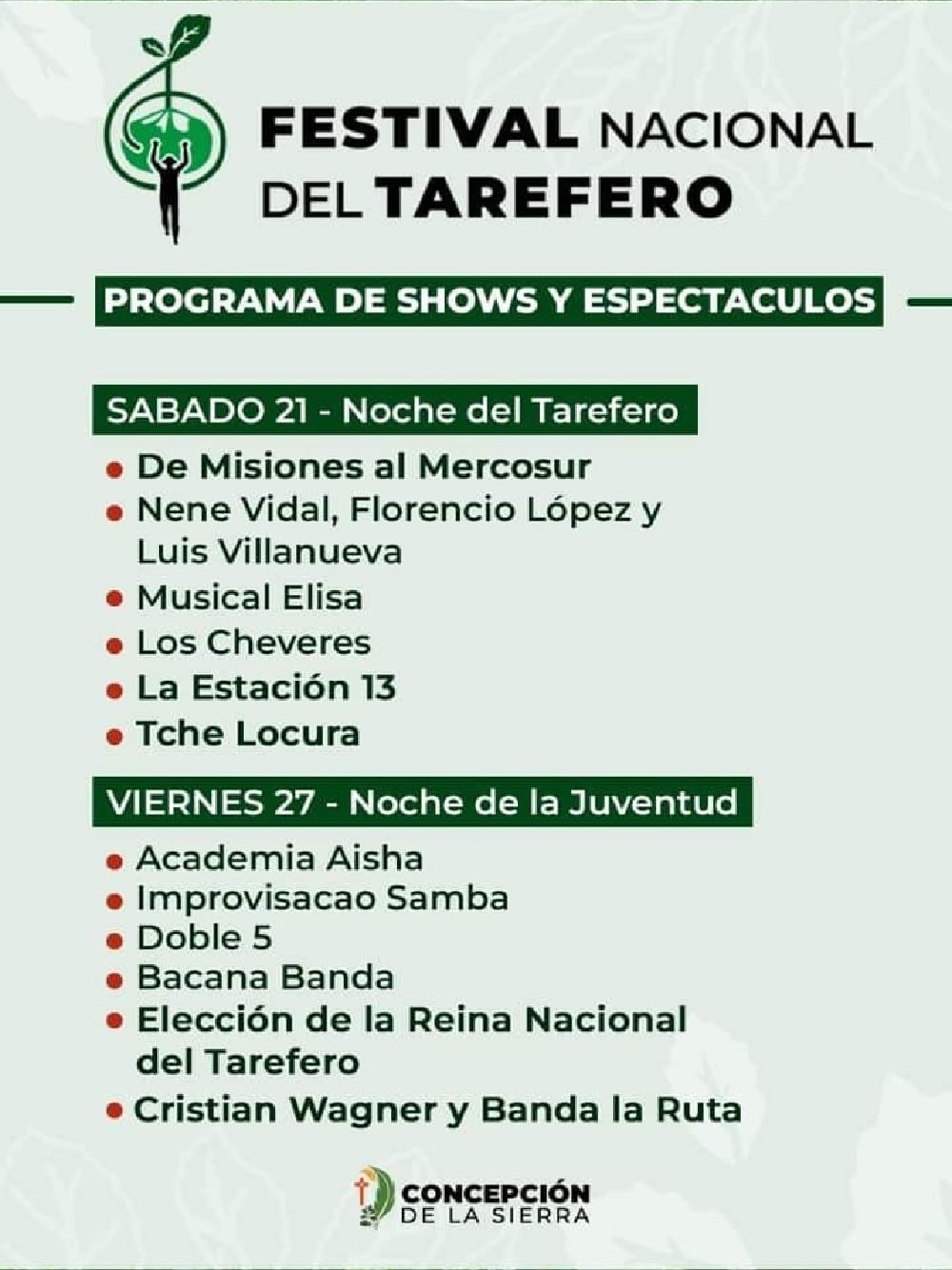 En homenaje a los que cosechan la hoja verde de la yerba mate, producto madre de Misiones, vuelve todo el esplendor de la Fiesta Nacional del Tarefero en Concepción de la Sierra. Un encuentro que se llevará a cabo el sábado 21 y luego el viernes 27 y sábado 28 de septiembre, que contará una importante grilla de artistas y la exposición de stand gastronómico y artesanal.