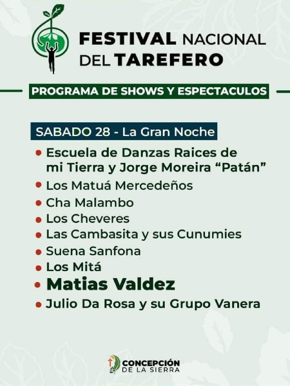 Luego el viernes 27, la Fiesta del Tarefero continuará en el marco del Aniversario de Concepción de la Sierra, con la “Noche de la Juventud” y la “Elección de la Reina Nacional del Tarefero”, que se desarrollará en el Polideportivo Municipal de Concepción. Una velada que contará con la exposición de 80 stand gastronómico y artesanos locales. Además habrá una gran grilla artística con las actuaciones de Academia Aisha, Improvisacao Samba, Doble 5 y Cristian Wagner y Banda la Ruta. Finalmente, el sábado 28 en el mismo lugar se realizará “La Gran Noche” que contará con la presentación de reconocidos artistas de la talla de Los Matuá Mercedeños, Cha Malambo, la Escuela de Danzas Raíces de Mi Tierra y Jorge Moreira “Patán”; Los Cheveres, Las Cambasitas y sus Cunumies, Suena Sanfona, Los Mitá, Matías Valdes y Julio Da Rosa y su grupo Vanera. El valor de las entradas serán de $4.000 y $6.000 pesos respectivamente y se podrán adquirir a través del sitio: concepciondelasierra.boleteriadigital.com.ar