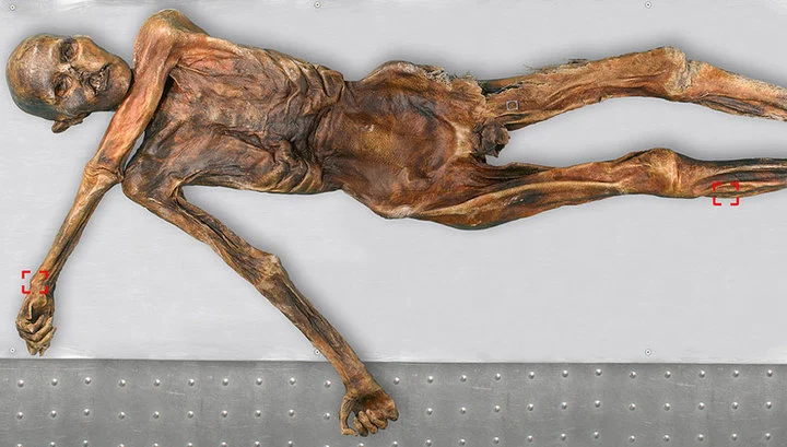 El 19 de septiembre de 1991, un par de escaladores alemanes se toparon en los Alpes italianos con una momia muy bien conservada, de unos 5.300 años de antigüedad. Conocido como Ötzi, se trató de un hombre de entre 30 y 45 años y 1,65 metro de altura. Tenía 57 tatuajes, algunos puntos que coinciden con los de la acupuntura, que se pudo haber hecho para tratar enfermedades. Su ropa estaba preparada para el frío, con zapatos anchos y resistentes al agua. También se encontró un hacha de cobre, un cuchillo de pedernal, una funda llena de flechas y otros objetos.