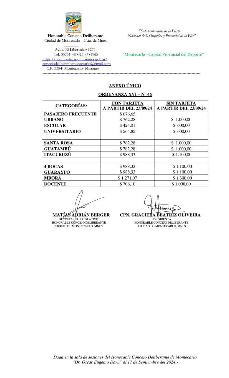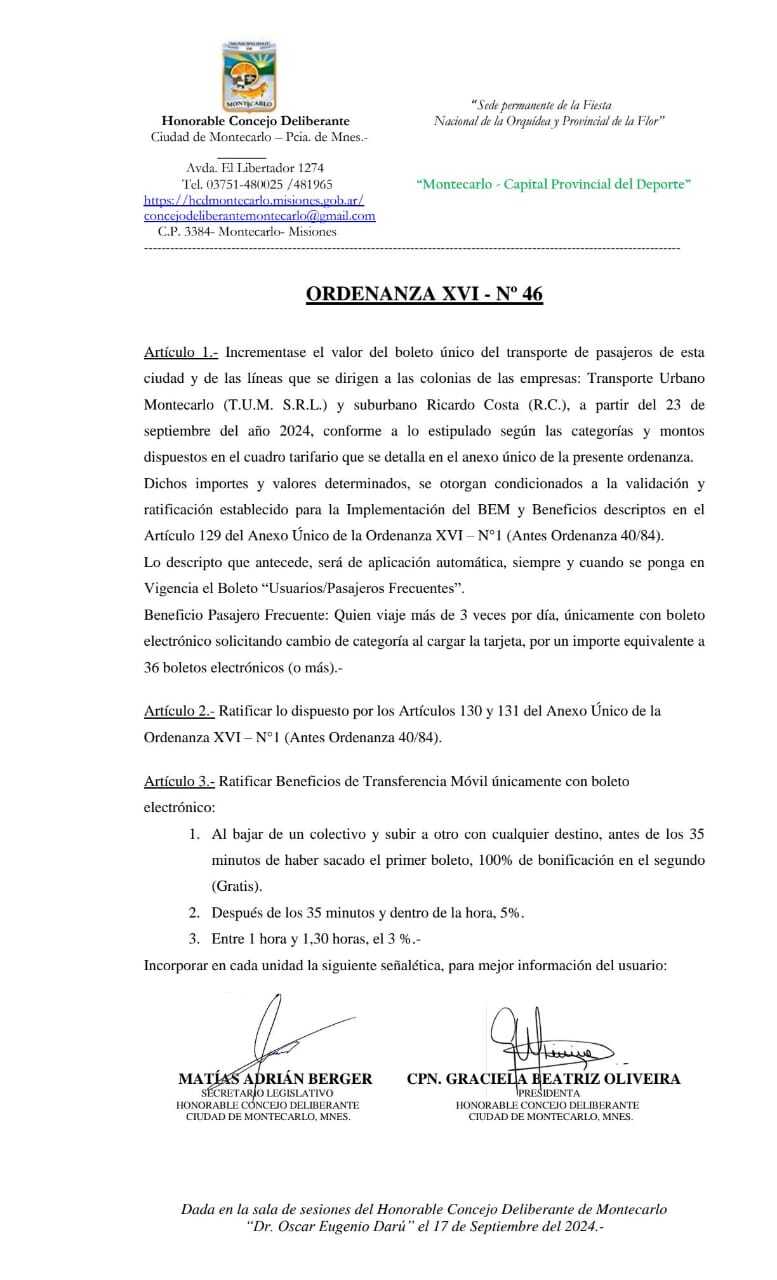 A través de la Ordenanza XVI Nº 46, el Concejo Deliberante de Montecarlo autorizó el incremento de los valores del boleto de pasajeros para las empresas Transporte Urbano de Montecarlo (T.U.M. S.R.L.) y suburbano Ricardo Costa (RC) a partir del próximo lunes 23 de septiembre.