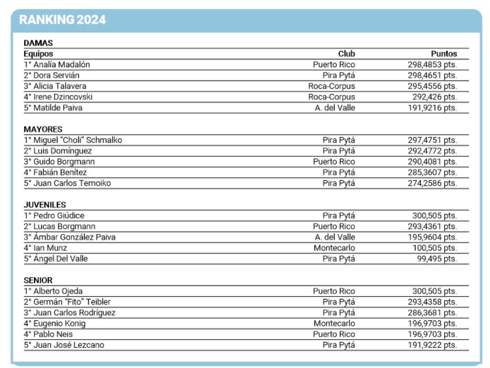 En juveniles, Pedro Giúdice cerró el año a puro pique. El posadeño, de notable crecimiento deportivo, se quedó con las tres fechas. En Puerto Rico sumó catorce puntos y le sacó seis de diferencia a su escolta, Ángel Del Valle, también del Pira Pytá. El tercer escalón fue para la local Valentina Flach, también con ocho puntos pero una pieza menos.