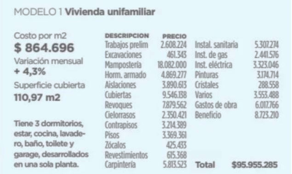 La construcción de una casa familiar de 80 m2, de una sola planta y tres ambientes superó los $96 millones.