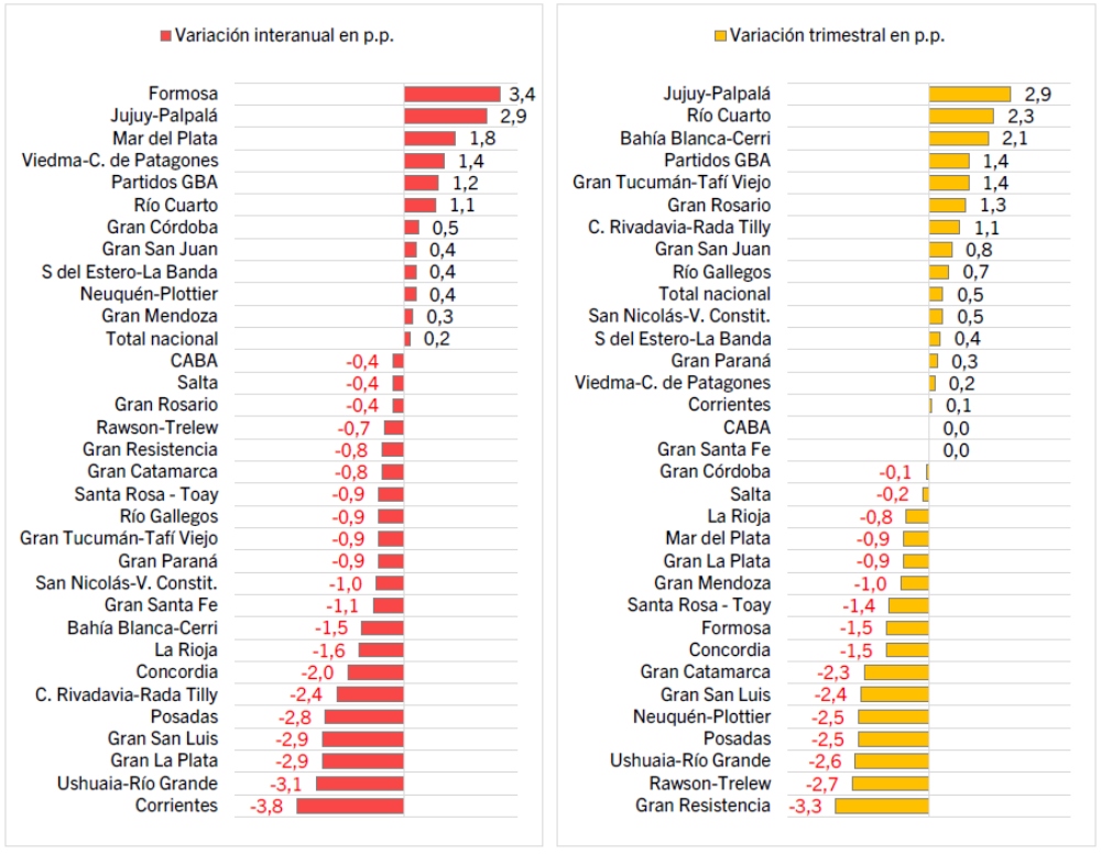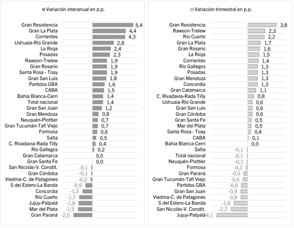 En la comparación trimestral, puede verse algunas mejoras: en el NOA (-0,9 p.p.) y en el GBA (-0,7 p.p.) se redujo la tasa de desocupación, aunque en el resto de las regiones ésta tuvo una expansión siendo la del NEA, nuevamente, la más importante (+1,9 p.p.).