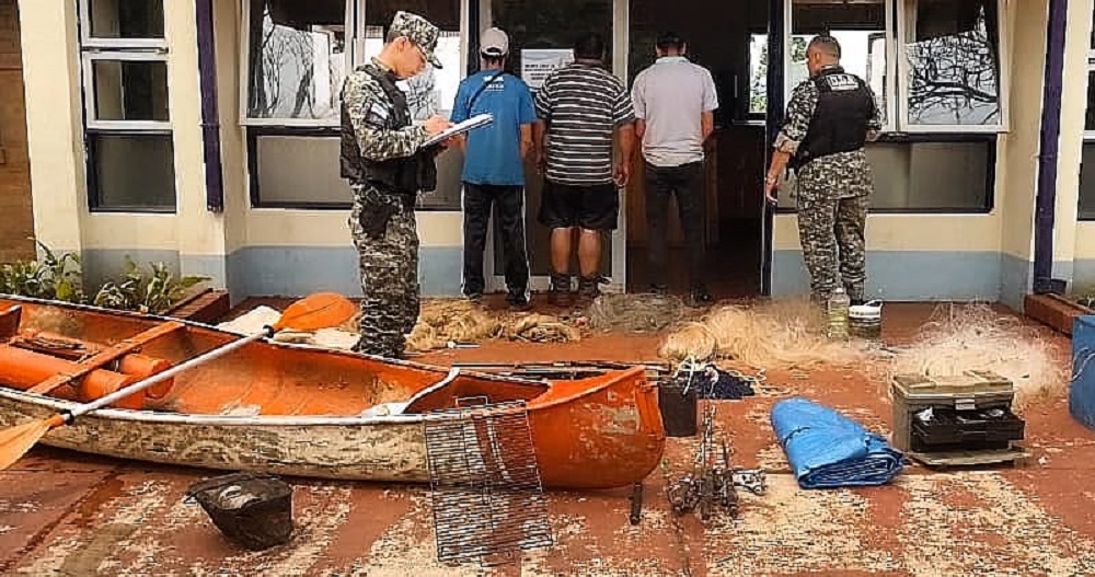 En poder de los cazadores ilegales, los agentes encontraron una escopeta calibre 14 con 12 cartuchos, un rifle calibre 22 con 12 cartuchos, seis redes de 200 metros, una piragua, una conservadora con varios peces (especies dorados y tararira), machetes y un espinel.