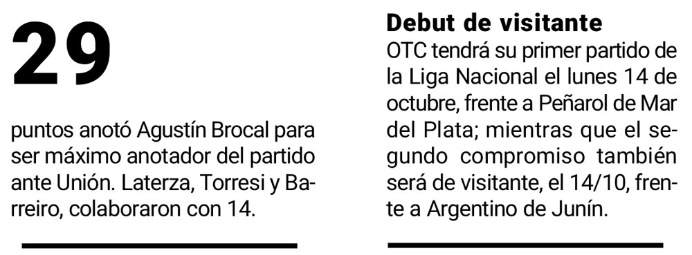 Pasando en limpio, los puntajes de OTC fueron los siguientes: Juan Laterza (14 puntos), Agustín Brocal (29), Jonatan Torresi (14), Agustín Barreiro (14), Will Vorhees (9); Kelvin Ramírez (6), Francisco Conrradi (9), Nicolás Quiroga (5), Alejo Azpilicueta (7), Santiago Rath (0) y Maximiliano Acevedo (0).