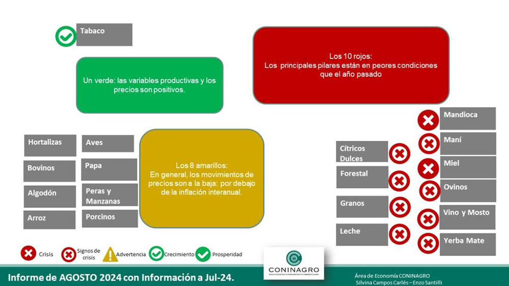 De acuerdo al semáforo de Coninagro, en septiembre de 2024 hay 10 sectores en rojo. La crisis se explica principalmente por baja demanda, costos elevados para el esquema productivo y precios estancados.