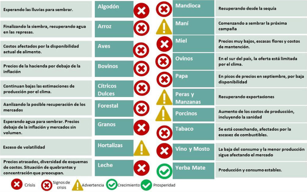 Por otra parte, se encuentran las economías regionales en amarillo o “advertencia”. Se explica a grandes rasgos por bajos precios al productor. Los sectores en esta situación son algodón, arroz, aves, bovinos, hortalizas, papa, peras y manzanas y porcinos.