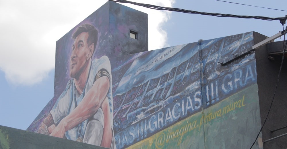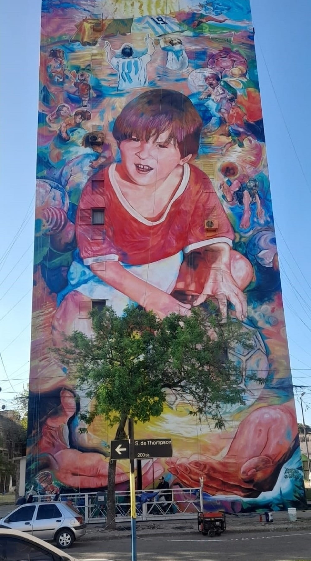 De otra Galaxia y de Grandoli: 360 m2 retratan el recorrido histórico de Lio, su historia, su pasión, el rol de su abuela en su vida. La pelota y el arco, sus amigos, su familia, su vida en su Rosario natal. Un mural que refleja a la persona que enorgullece a un país entero en el primer club en el que jugó el astro mundial.