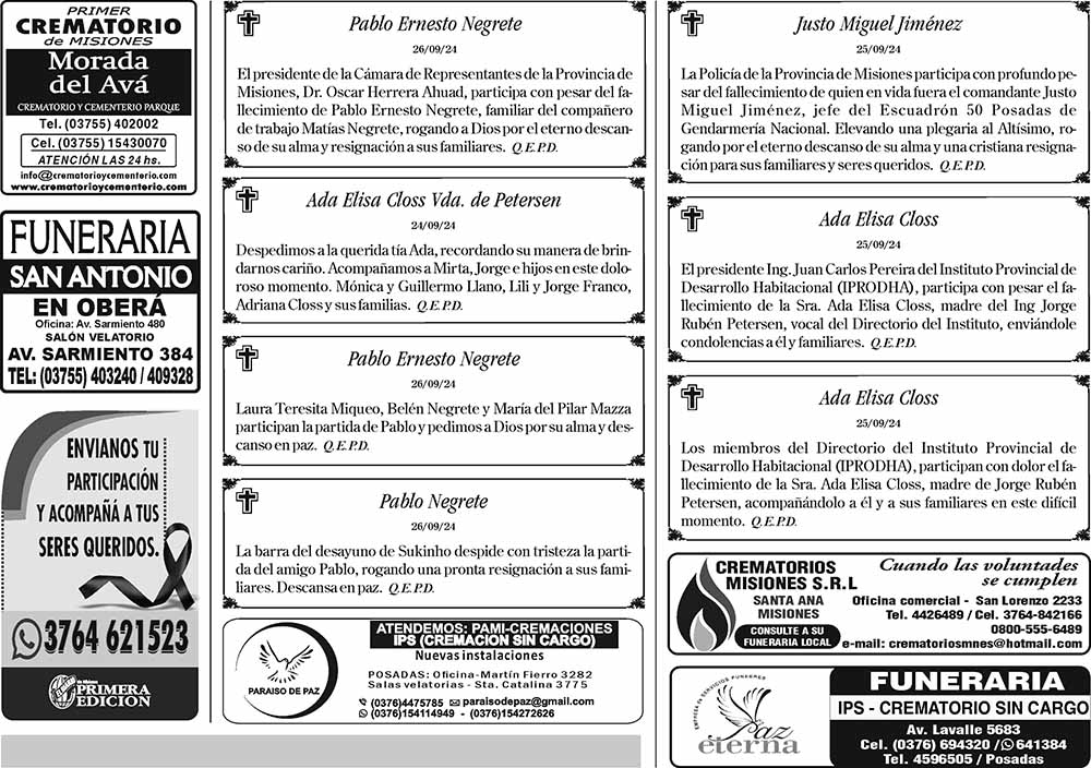 • Fúnebres del Miércoles 25 de Septiembre de 2024