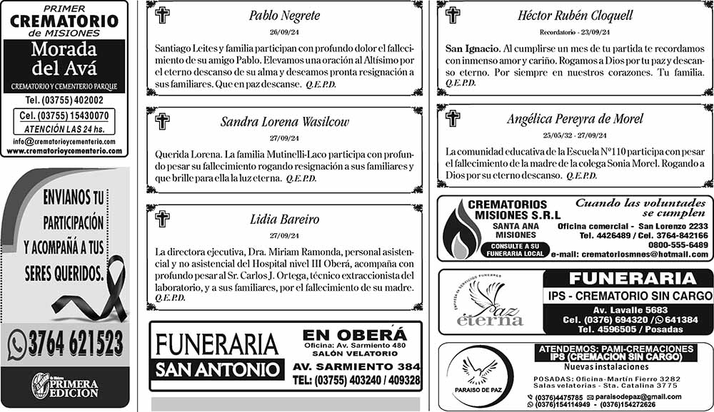 Fúnebres del Sábado 28 de Septiembre de 2024