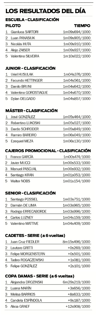 Por otro lado, en Escuela, Gianluca Sartori se adueñó de la pole con un registro de 1m09s694/1000, escoltado por Luan Panasiuk y Nicolás Huta; mientras que en Cadetes la pole position fue para Francisco Morgenstern; al tiempo que Alejandra Drozinski fue la más rápida en la Copa Damas.