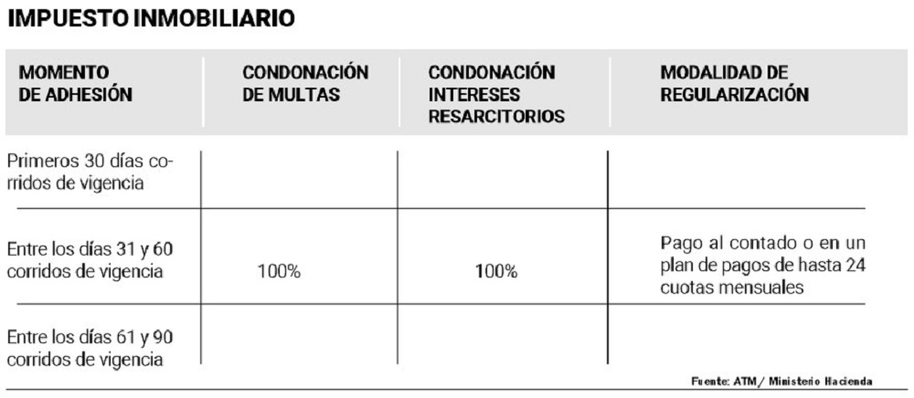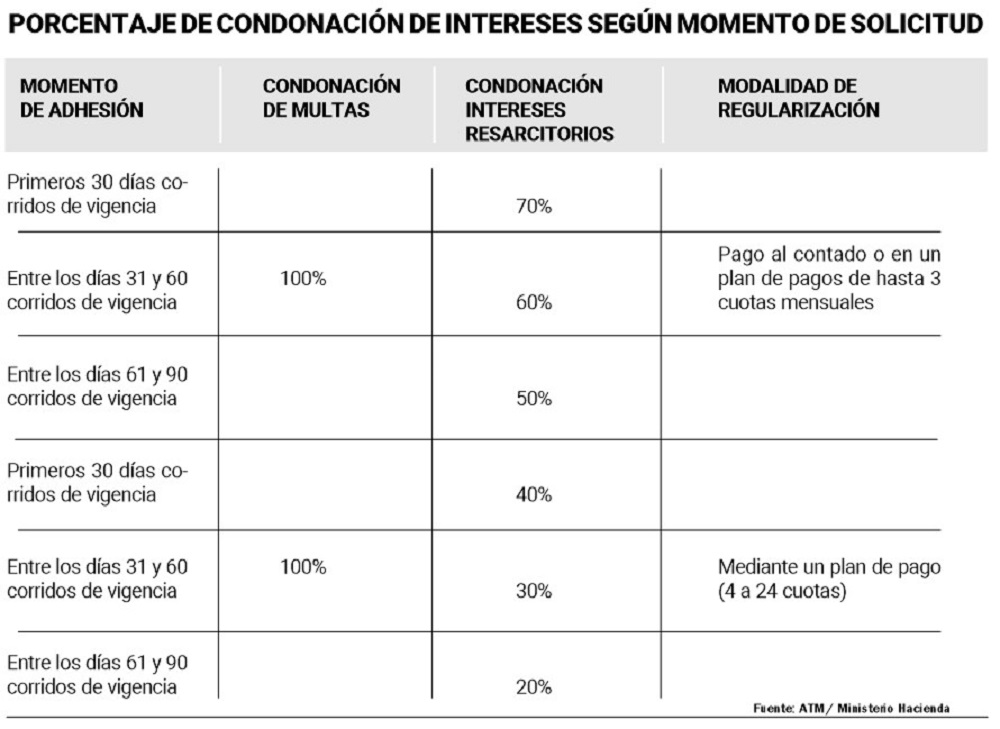 • Planes de contado o hasta tres cuotas mensuales, con la mayor condonación de intereses (desde el 70% hasta el 50% según el momento en que se soliciten).