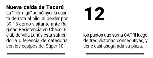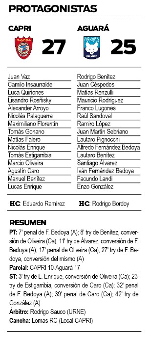 Parecía controlado el partido, pero un penal de Fernández Bedoya volvió a acercar a Aguará y por la misma vía, Caro volvió a estirar la diferencia. Ya en tiempo de descuento, a los 42, y con el 27-20 favorable a CAPRI, el ingresado Facundo González apoyó un nuevo try para la visita y le puso suspenso al partido. El remate de Fernández Bedoya dio en uno de los palos y se fue afuera, vino el pitazo final de Sauco y todo CAPRI festejó la apretada y sufrida, pero muy importante victoria, por 27 a 25.