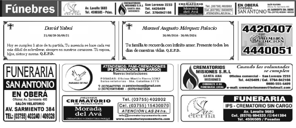 Fúnebres del Lunes 30 de Septiembre de 2024