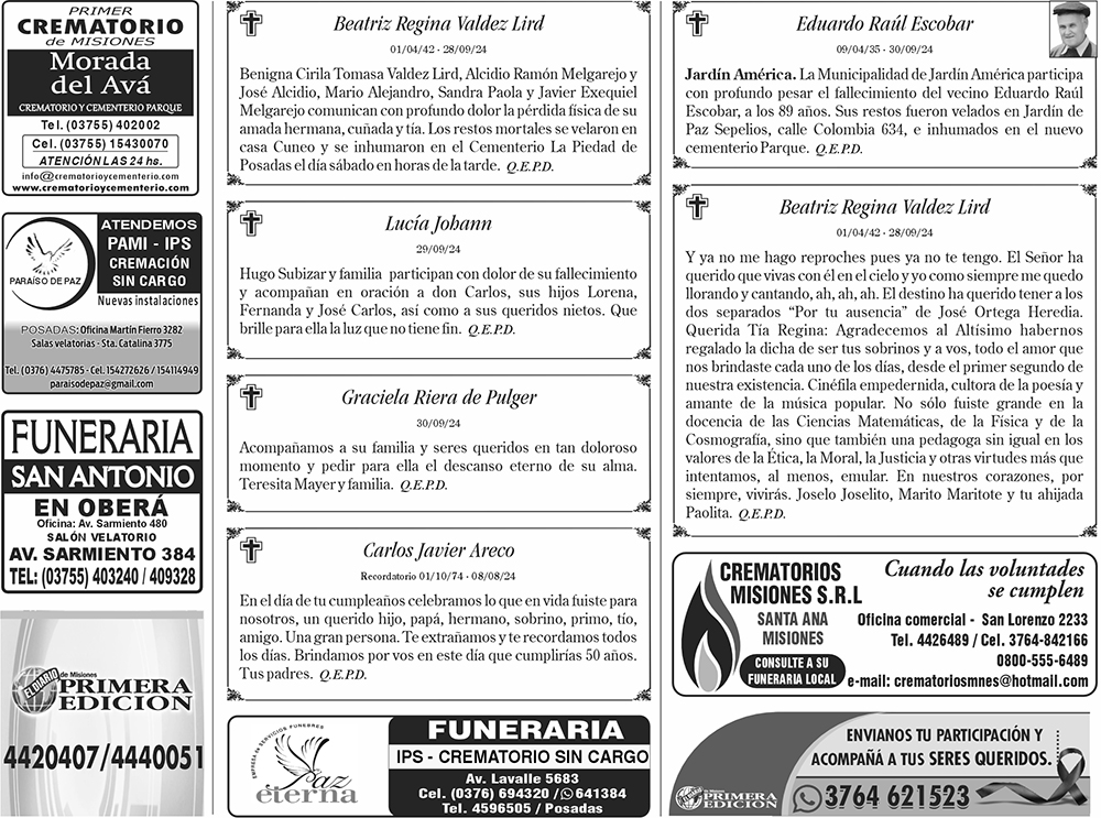 • Fúnebres del Lunes 30 de Septiembre de 2024