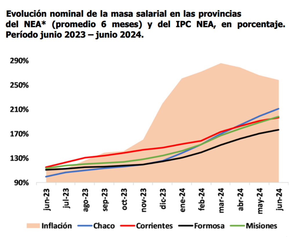 Las otras tres provincias del NEA también marcan un retroceso del salario frente a la inflación: “Al comparar el mes de junio de 2024 (último dato disponible de la masa salarial) respecto a igual período del 2023, el IPC NEA registró un incremento interanual del 258,7% mientras que la masa salarial privada registrada en la provincia de Chaco creció un 211%, en la provincia de Corrientes un 196,3%, y en la provincia de Formosa un 176,7%” se precisó.