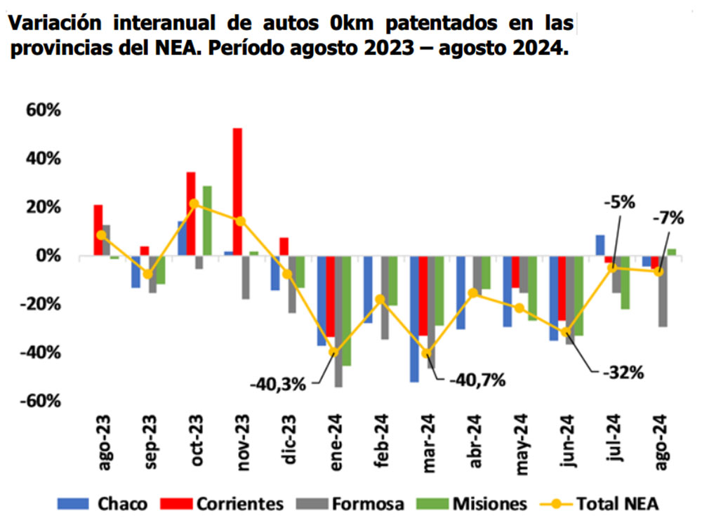 Por otro lado, si se compara agosto de 2024 respecto a igual mes del año anterior, se observa que Formosa fue la que registró la mayor caída en el patentamiento de autos 0km (-29,6%), seguida por la provincia de Corrientes (-5,4%), y luego la provincia de Chaco (-4,6%), en cambio la provincia de Misiones, registró un incremento interanual de 2,6% en la cantidad de autos 0km patentados durante el período en cuestión.