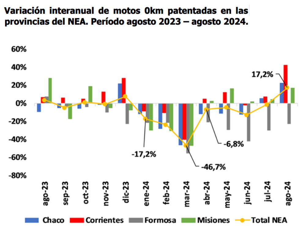 Al comparar agosto de 2024 respecto a igual mes del año anterior, se observa que únicamente la provincia de Formosa aún no ha logrado recuperarse ya que registró una importante caída de 22,7% en el patentamiento de motos 0km.