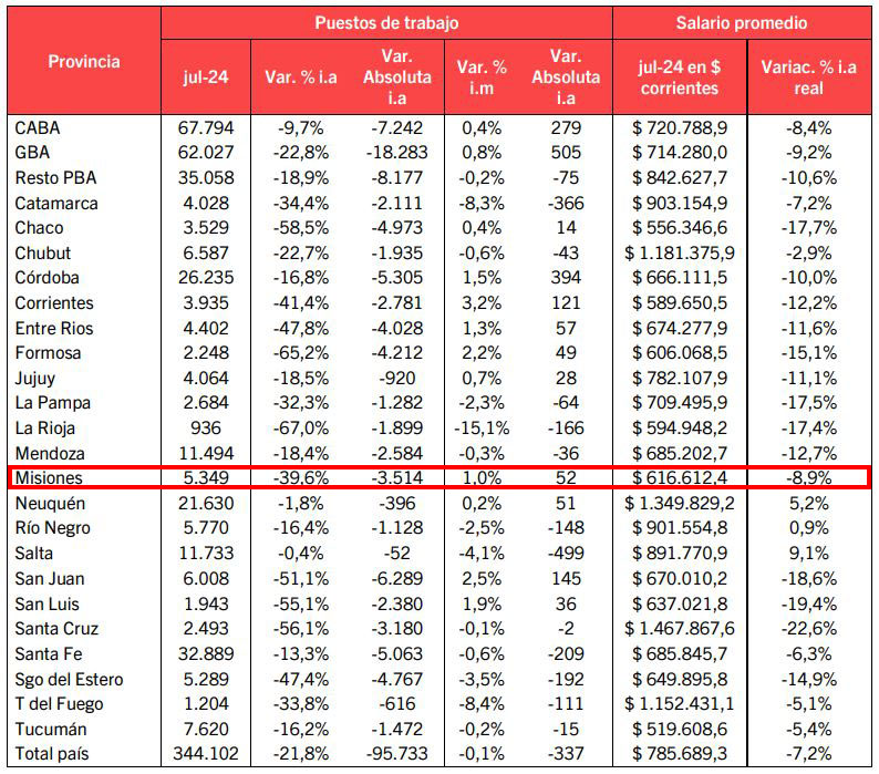 Misiones, en la comparación interanual perdió 3.514 puestos de trabajo (-39,6%).