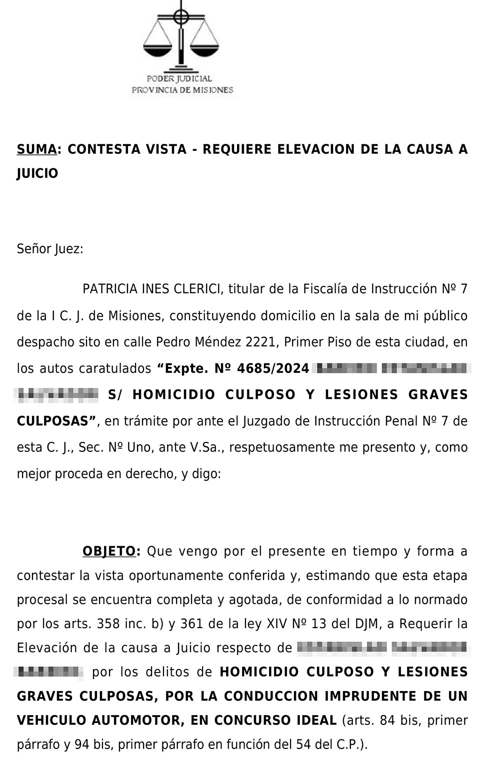 “Que vengo por el presente en tiempo y forma a contestar la vista oportunamente conferida y, estimando que esta etapa procesal se encuentra completa y agotada, de conformidad a lo normado por los arts. 358 inc. b) y 361 de la ley XIV N2 13 del DJM, a requerir la Elevación de la causa a Juicio (…) por los delitos de HOMICIDIO CULPOSO Y LESIONES GRAVES CULPOSAS, POR LA CONDUCCION IMPRUDENTE DE UN VEHICULO AUTOMOTOR, EN CONCURSO IDEAL (arts. 84 bis, primer párrafo y 94 bis, primer párrafo en función del 54 del C.P.).”, expone el documento.