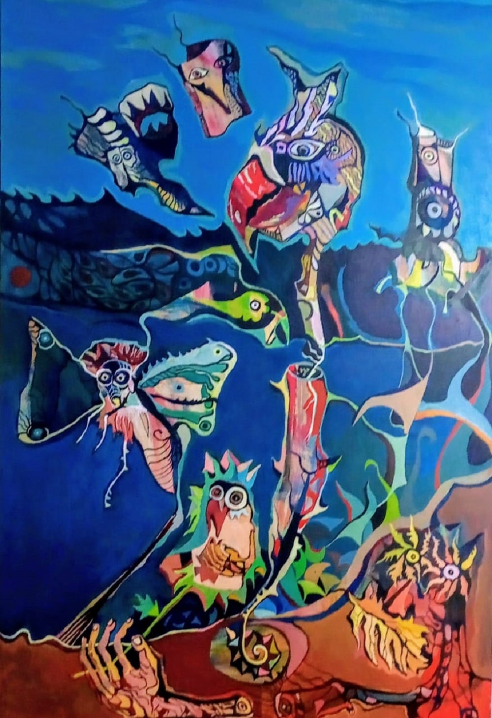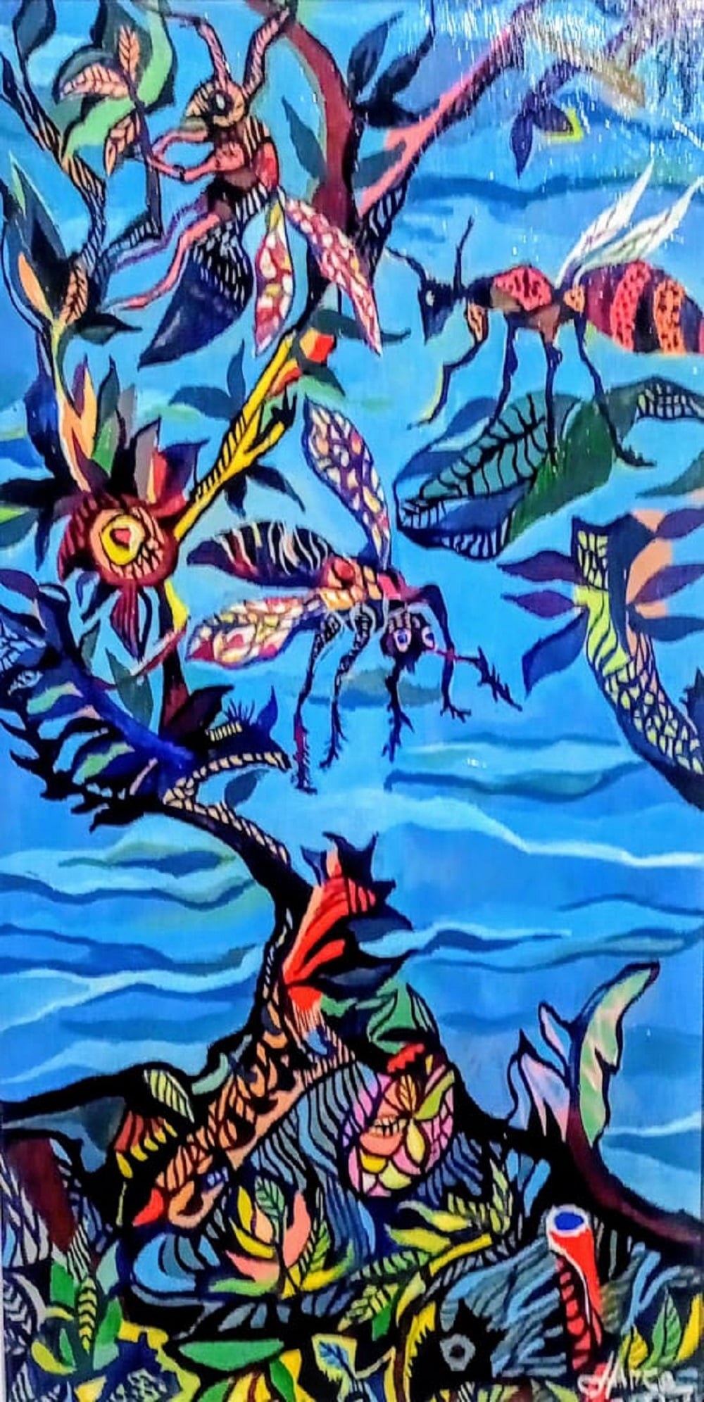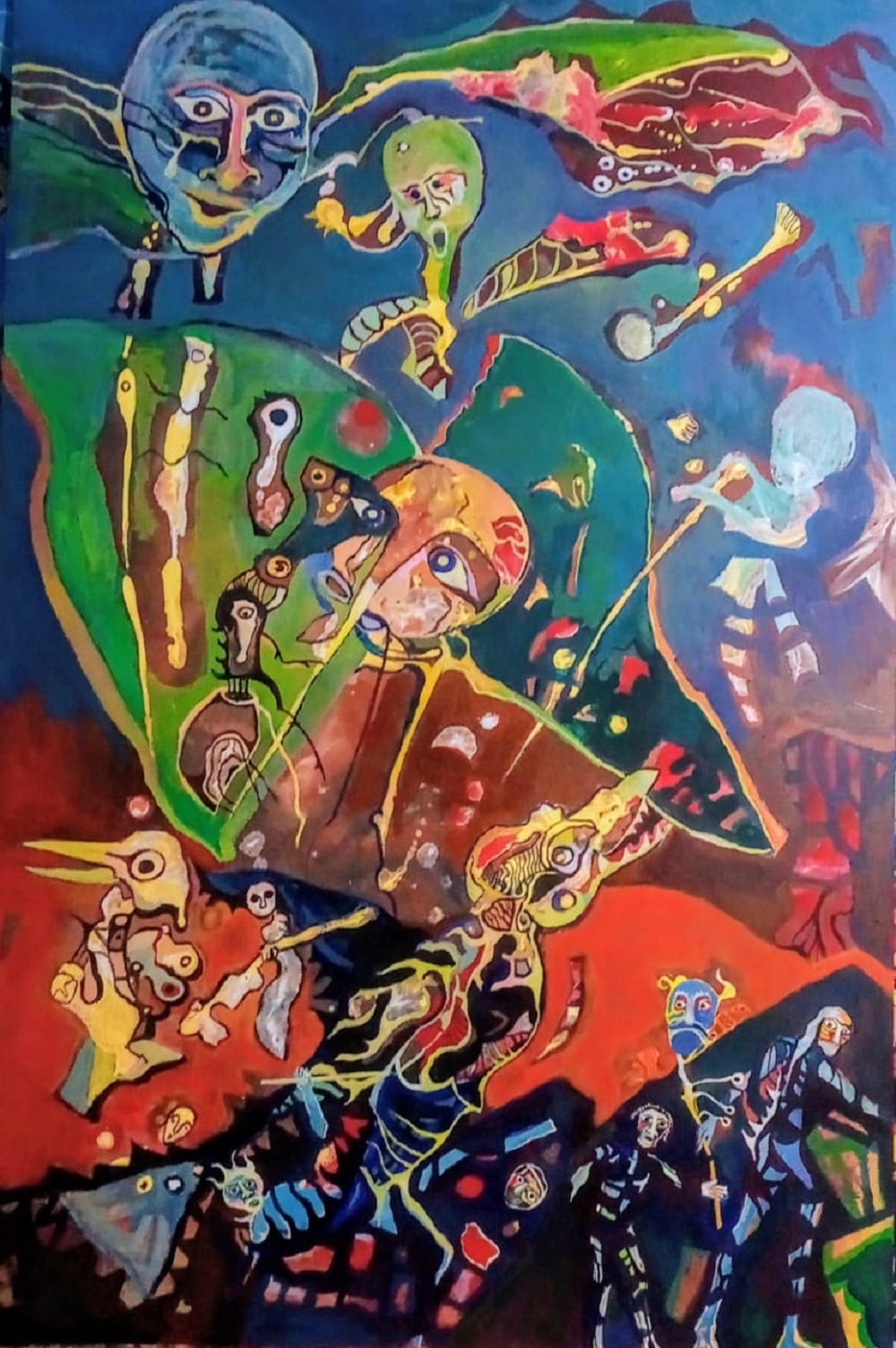 “Aves, flores y mariposas simbolizan la belleza y fragilidad de la vida, mientras que cráneos y formas abstractas aluden a la lucha, el misterio y la muerte. La mirada penetrante de los búhos y los ojos omnipresentes interpelan al espectador, invitándolo a reflexionar sobre la conexión entre el ser humano y la naturaleza, su búsqueda de libertad y la complejidad de sus emociones”.