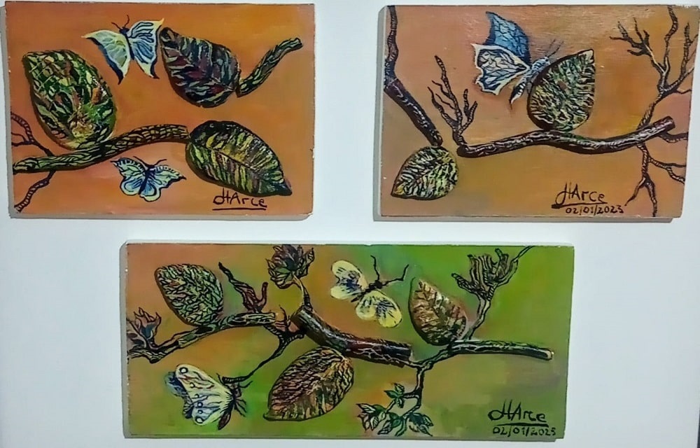 “Palpitantes por su forma y color, abstractas ante nuestra selva, las obras revelan su profunda conexión con la exuberancia del paisaje misionero. Es así como las formas orgánicas, inspiradas en la flora y fauna de la región, que nos resuenan sin ser fotográficas, se mezclan en colores intensos y trazos expresivos. La inserción de elementos tridimensionales es un homenaje al artista rosarino Antonio Berni, quien en la década de 1960 revolucionó el arte local. Arce nos interroga y viene a nuestro encuentro, nos interroga, agregando una dimensión visualmente táctil, arraigando así, su obra a la tierra.