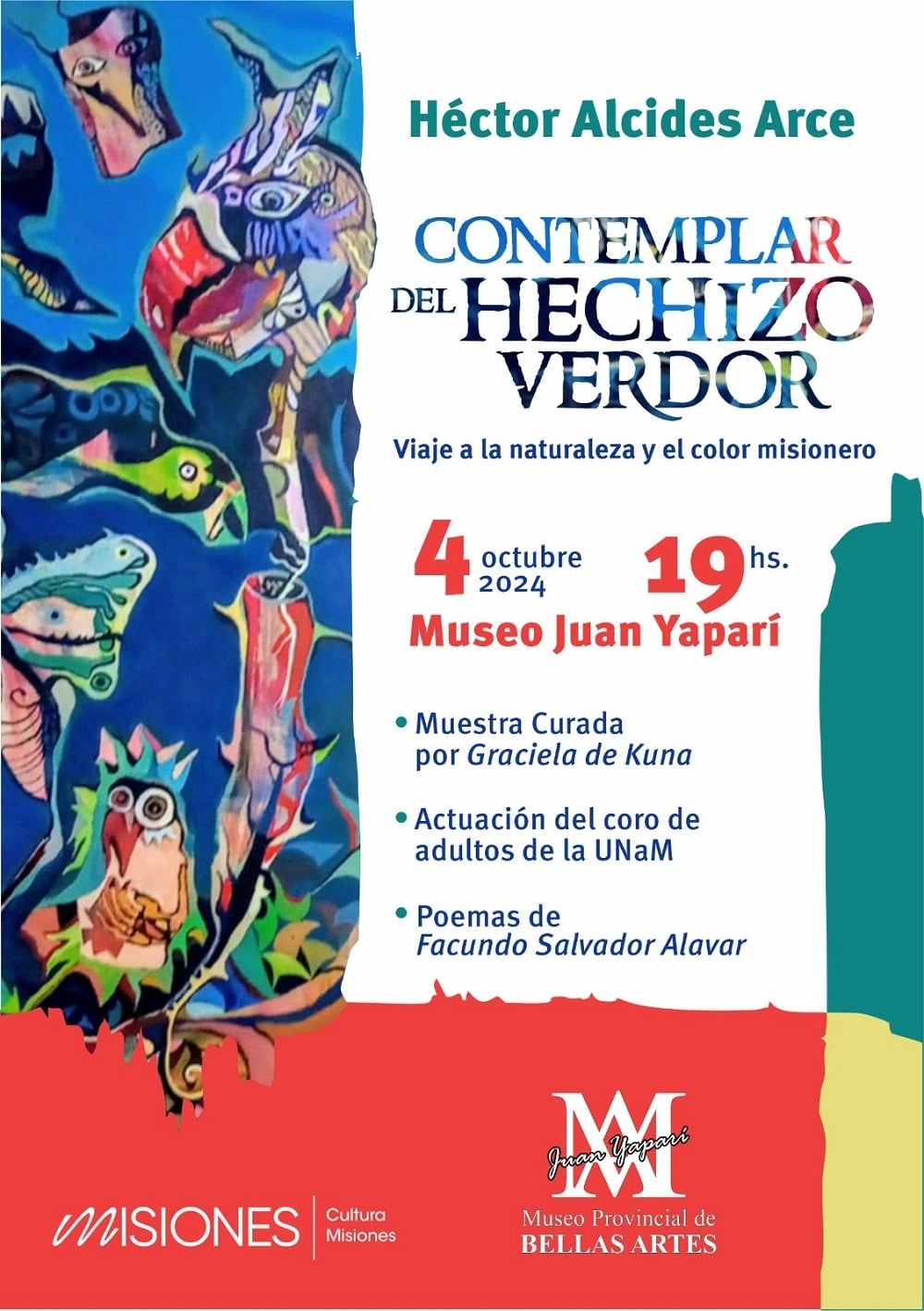 El Museo Provincial de Bellas Artes Juan Yaparí, inaugura la muestra del artista Héctor Alcides Arce denominada “Contemplar del Hechizo Verdor”. Una exposición que incluye los poemas de Facundo Salvador Alavar y la apertura contará con la actuación del Coro de adultos de la UNaM. La cita será este viernes a las 19 horas, en el espacio de Sarmiento 1885, de Posadas.“Viaje a la naturaleza y el color misionero. Confluencias, contradicciones y derivas del arte”,es el subtítulo de esta muestra que ha sido curada por Graciela de Kuna.